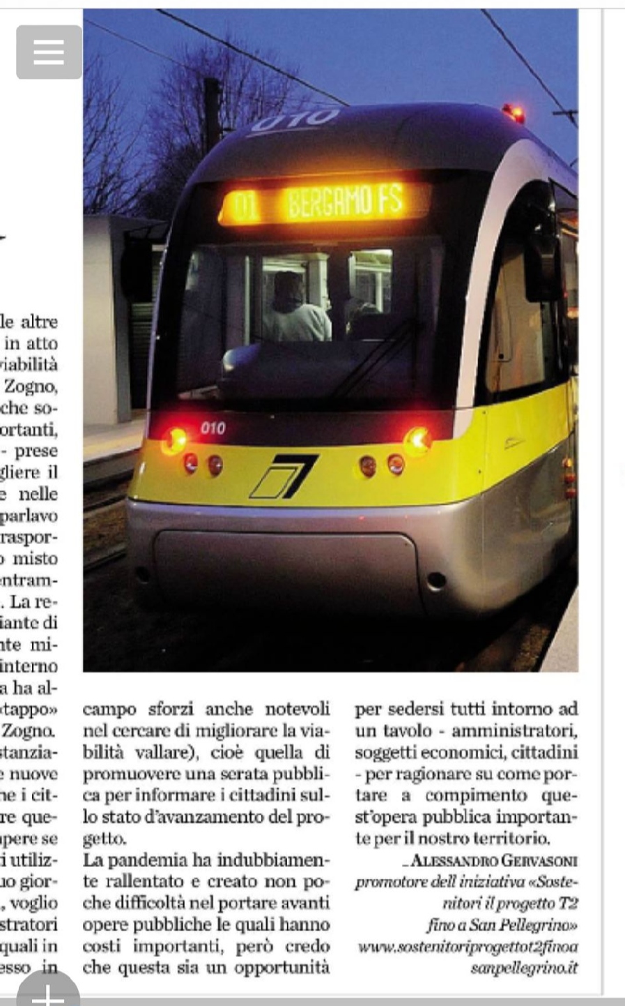 Noi da prima come associazione ed oggi come Sostenitori Progetto T2 fino a San Pellegrino , abbiamo portato avanti e sostenuto l'idea che se la Valle Brembana vuole trovare una soluzione efficace e duratura al problema viabilità deve - insieme al completamento della Variante di Zogno e al completamento in parallelo del terzo lotto della Tangenziale Sud- deve spingere affinché il Tram della Valle Brembana possa trasformarsi da sogno scritto sulla carta a realtà; la Valle Brembana avendo come unica strada veicolare la S.s. 470 non può pensare che aumentando la quantità di strade il traffico diminuisca; bensì bisogna ragionare su un sistema integrato di trasporto dove i vari mezzi si compensano.