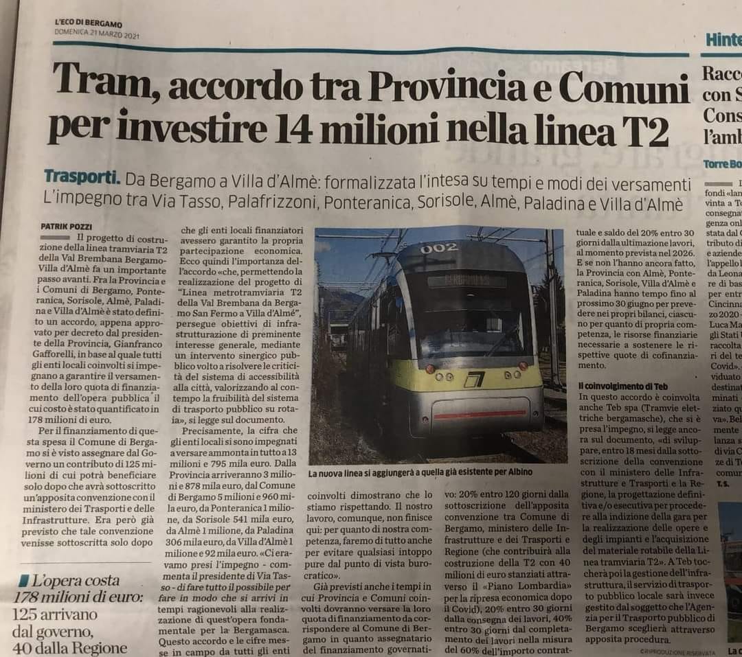 Buone notizie per la Valle Brembana! Oggi l'articolo su l'Eco di Bergamo parla dell'accordo, in fase di formalizzazione, tra Provincia e Comuni sulla linea T2, per lo stanziamento di 14 milioni di euro da investire sulla tratta Bergamo-Villa d'Almè.Ad ogni valligiano l'impegno di chiedere un prolungamento della linea ferroviaria che approdi, quantomeno, a San Pellegrino Terme.#curadelFerro#ValleBrembana#LineaT2